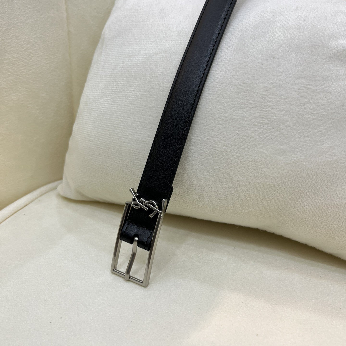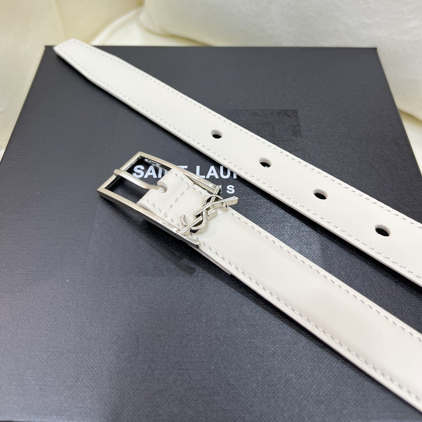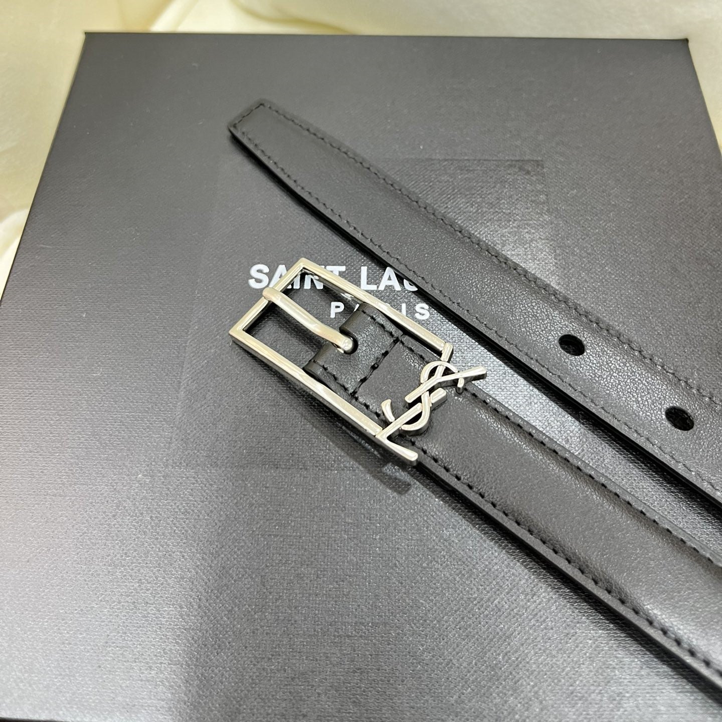 Detalhe logo sаіnt lаurеnt cassandre na fivela.